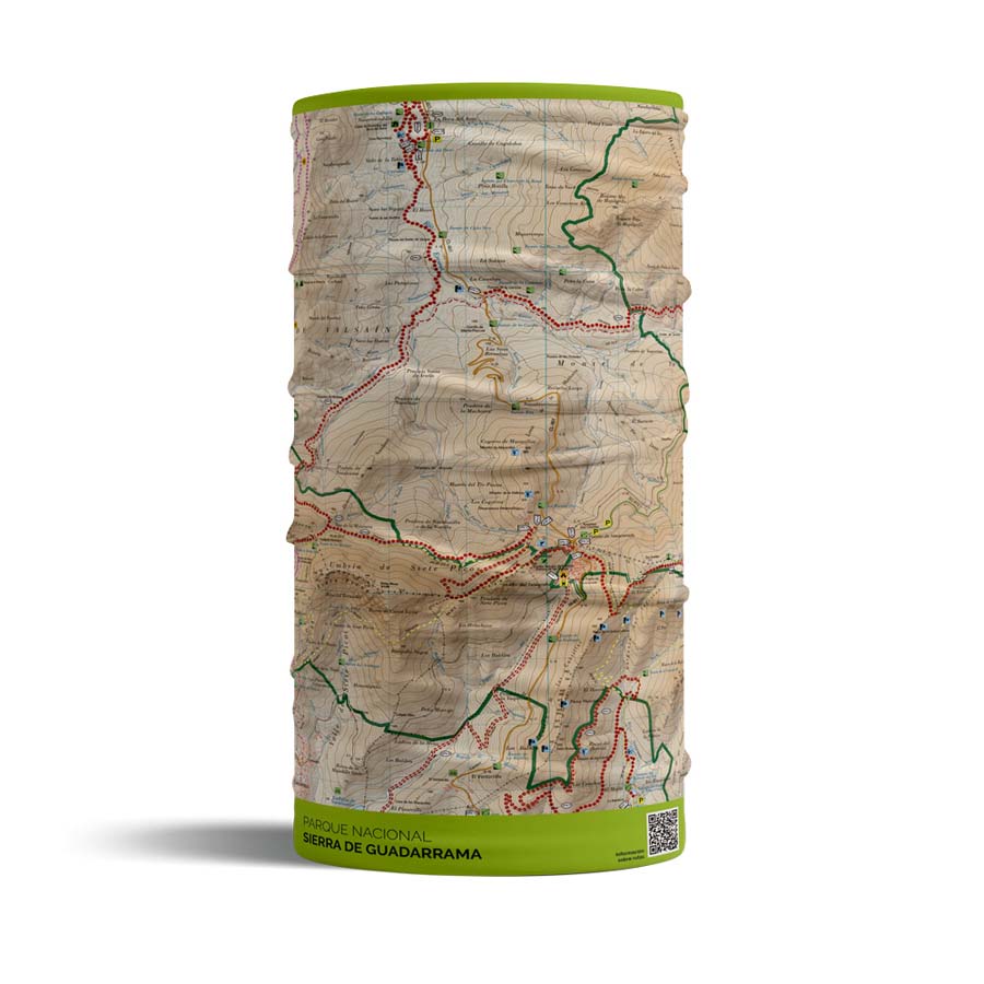 Bufanda tubular de protección térmica avanzada con el estampado del Mapa del Parque Nacional Sierra de Guadarrama. Es una prenda diseñada para proteger y abrigar el cuello, la cara y la cabeza en climas fríos. Tejido de fibras cerradas elástico, lavable y sin costuras para condiciones extremas.