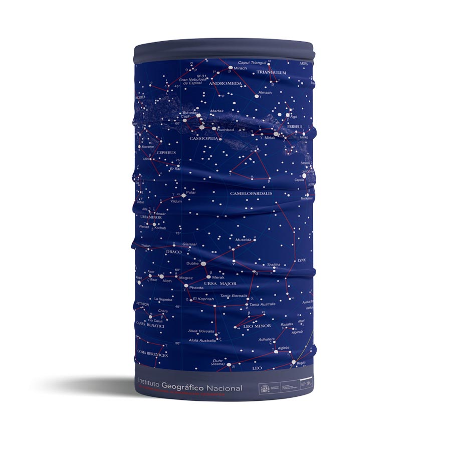 Bufanda tubular de protección térmica avanzada con el estampado del Mapa del cielo en España. Es una prenda diseñada para proteger y abrigar el cuello, la cara y la cabeza en climas fríos. Tejido de fibras cerradas elástico, lavable y sin costuras para condiciones extremas.